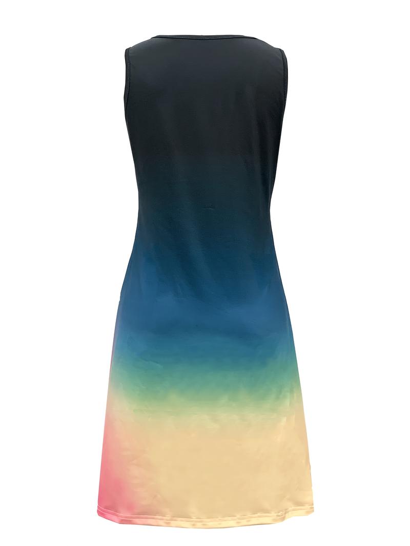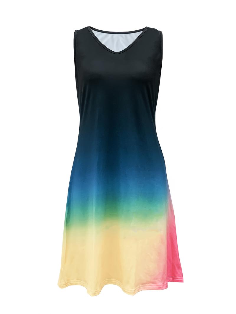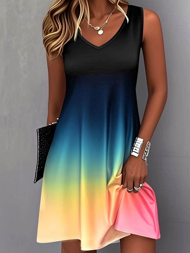 فستان نسائي صيفي بدون أكمام برقبة على شكل حرف V بطبعة متدرجة - أزرق أومبري إلى وردي، خفيف الوزن وقابل للغسل في الغسالة، ملابس منتجع نسائية سهلة العناية، فساتين صيفية كاجوال، أزياء العطلات، سترة نسائية أنيقة من البوليستر المحبوك متعدد الألوان